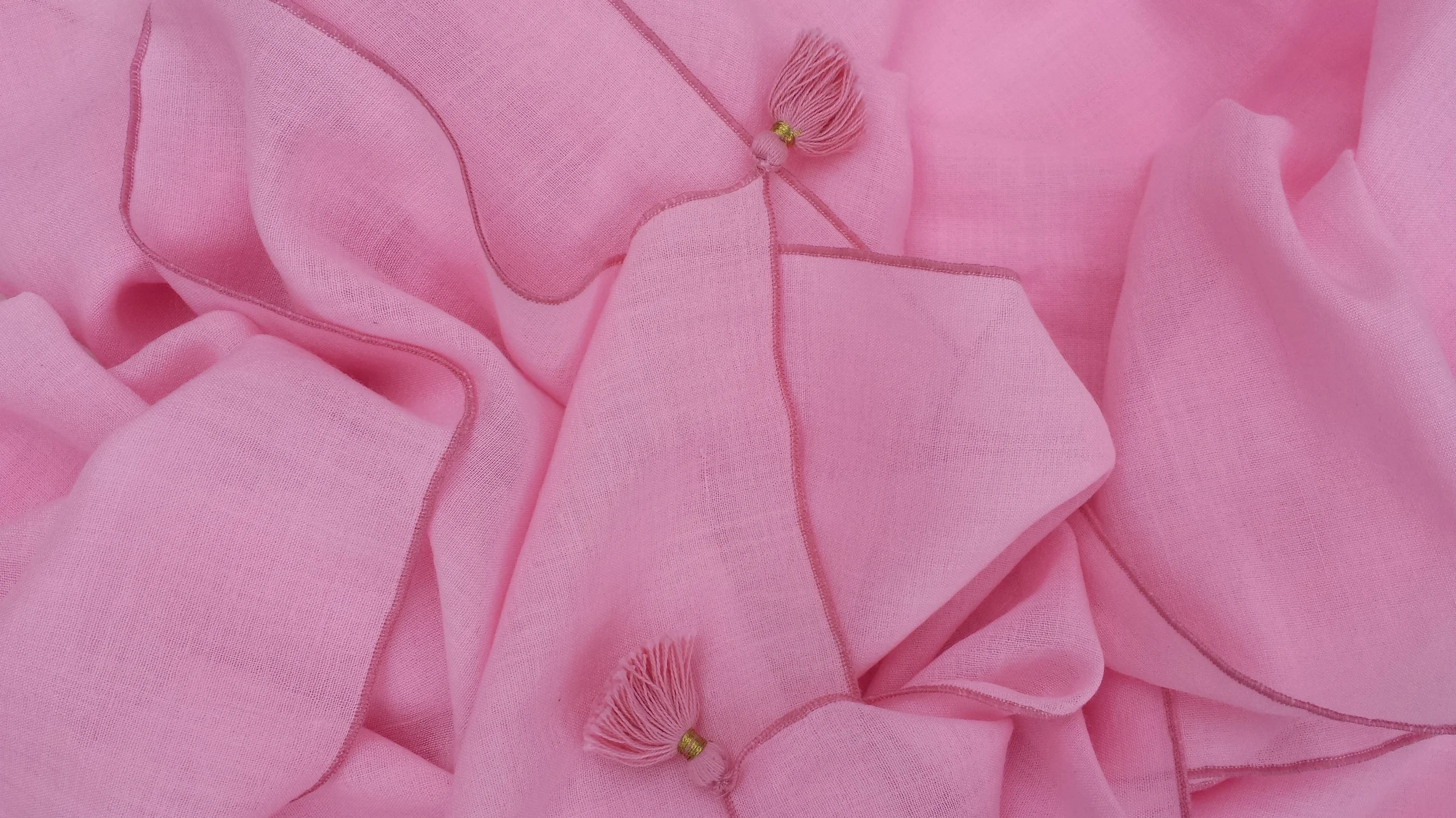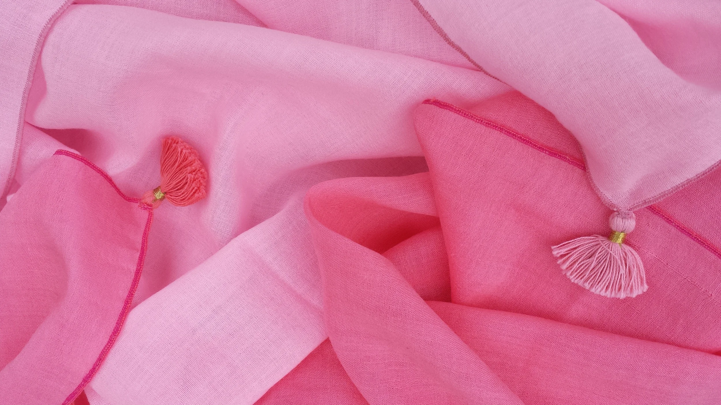 Our Whisper Wrap is now available in new summer colors- Pale Petal and Deep Coral. We love color soaking this beautiful material. The cashmere/ silk blend is so soft and fun to work with. Each wrap is finished with corner tassels and signature triple thread edge.